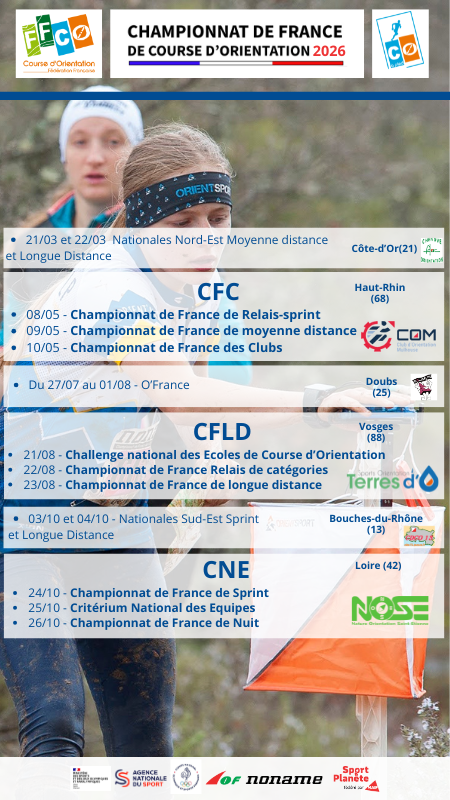 Vous avez l’opportunité de découvrir des terrains diversifiés, avec des courses nationales organisées dans le Nord-Est (Côte-d'Or) et le Sud-Est (Bouche-du-Rhône). Trois week-ends se distinguent particulièrement dans cette programmation avec l'organisation des Championnats de France qui rassembleront des milliers d'orienteurs :